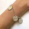 The pure trisple sterling silver disc bracelet features 3 disc charms that can be personalized with names, dates and symbols; hearts, stars, horse, infinity symbols. The personalization is hand stamped by Hilary and June. The discs come on a classic sterling silver charm bracelet.