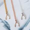 The 9ct Rose and 9ct Yellow Gold wishbones come on a rose or gold plated chain. The 9ct white gold wishbone come on a sterling silver chain.